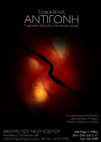 DURATION COMPOSER’S NOTES PERFORMANCE IDENTITY | 1 hour CHORIAMBUS TC’s first production has been Sophocles’ Antigone, presented in original ancient Greek text by 2 performers-musicians (2007-09). It explored the musical tissue of Sophoclean poetry and activated the ancient function of such a fundamental scenic synthesis, as an actor, who undertakes all main roles, paired with a musician, who enlightens the pre-designed inner musical movement of the actions; namely a theatrical analogy of the function of the priest and chant singer. Choral songs were executed according to the original metrical-rhythmical sets of verses designed thoroughly by Sophocles himself, who happened to be one of the most eminent musicians of his time. All main characters (Antigone, her sister Ismene, king Kreon, his son Aemon, soothsayer Teiresias) as well as the Chorus (consisted by distinguished elderly Lords of Thebes), were interpreted on stage by one actor, Aris Biniaris, who explored his full physical potential in order to achieve necessary differentiations of roles. The musician, Smaro Gregoriadou, supported the action by unveiling the musical tissue of the play and composed the original music. Antigone shared more than 60 performances with Greek and international audiences and received a remarkably positive response. Read here more about Smaro’s research on the ancient Greek drama PDF in Greek: ΟΥΣΙΑ ΚΑΙ ΑΞΙΑ ΤΗΣ ΜΟΥΣΙΚΗΣ ΤΕΧΝΗΣ ΣΤΟ ΔΡΑΜΑ Musical research, composition and direction: Smaro Gregoriadou Theatrical development: Aris Biniaris Artistic direction: Yorgos Biniaris Actor: Aris Biniaris Musician: Smaro Gregoriadou |